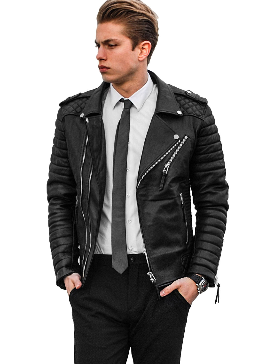 "Experience unparalleled style with our Men Leather Jacket. Crafted from premium genuine leather, this jacket offers both durability and a luxurious feel. The slim fit design highlights your silhouette, making it a perfect addition to any wardrobe. Whether you're riding your motorcycle, going out for a casual evening, or attending a formal event, this versatile jacket suits every occasion."