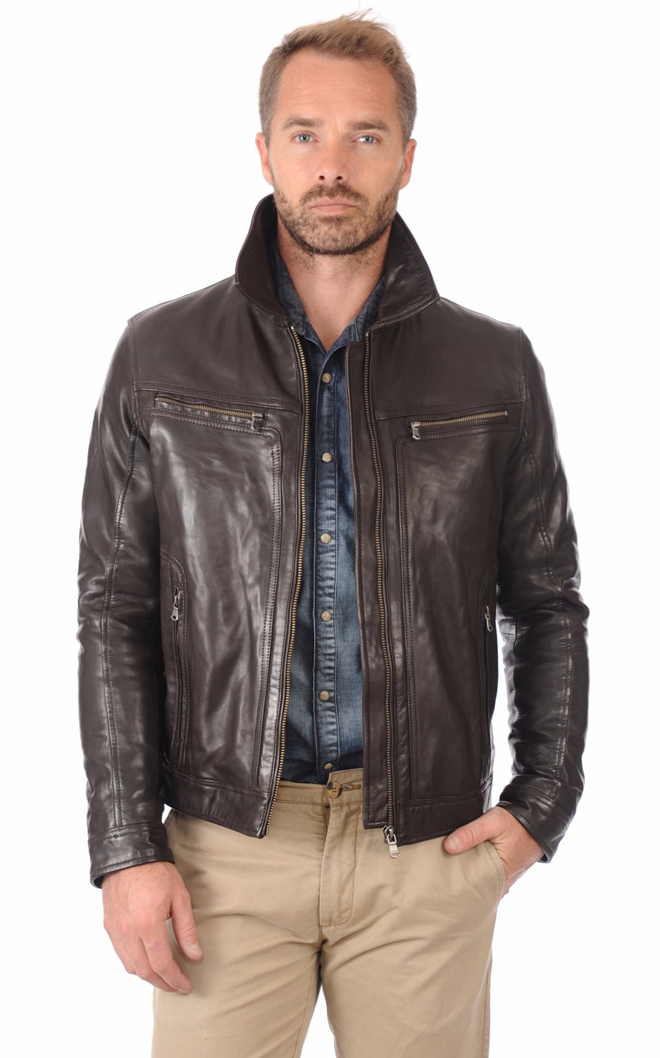 "Experience unparalleled style with our Men Leather Jacket. Crafted from premium genuine leather, this jacket offers both durability and a luxurious feel. The slim fit design highlights your silhouette, making it a perfect addition to any wardrobe. Whether you're riding your motorcycle, going out for a casual evening, or attending a formal event, this versatile jacket suits every occasion."