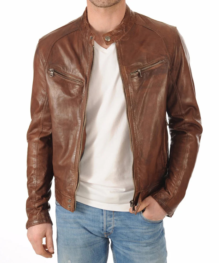 "Experience unparalleled style with our Men Leather Jacket. Crafted from premium genuine leather, this jacket offers both durability and a luxurious feel. The slim fit design highlights your silhouette, making it a perfect addition to any wardrobe. Whether you're riding your motorcycle, going out for a casual evening, or attending a formal event, this versatile jacket suits every occasion."